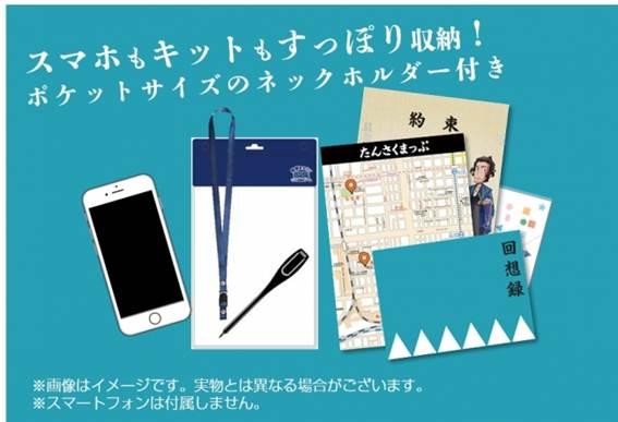 街歩き型リアル謎解きゲームコンテンツに便利な、ネックホルダー付きのキットです。ユーザーは、キットだけでなくスマートフォンや筆記用具なども首から下げて持ち運びができます。